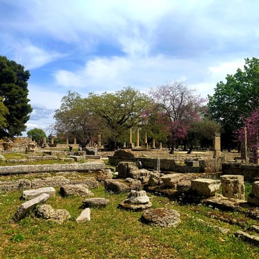 Ми почнемо з гімнасію — великого комплексу, де атлети тренувалися перед змаганнями. Поруч знаходиться палестра — двір, оточений колонадами, де відбувалися тренування з боротьби та боксу. Далі ми побачимо Леонідіон — своєрідний готель античної Олімпії, де під час ігор зупинялися почесні гості. Після цього підійдемо до храму Зевса — колись найбільшої споруди святилища. Саме тут стояла знаменита статуя Зевса роботи Фідія — одне із семи чудес стародавнього світу. Поруч знаходиться храм Гери — один із найдавніших храмів Греції. Сьогодні саме біля нього перед кожними сучасними Олімпійськими іграми відбувається церемонія запалення олімпійського вогню. Також ми побачимо німфеум — римську споруду з фонтанами, після чого пройдемо через арковий прохід на стадіон, де проходили головні змагання Олімпійських ігор.