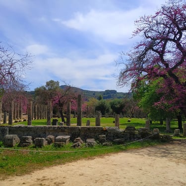 Спочатку ми пройдемося територією святилища, де протягом понад тисячі років проходили Олімпійські ігри — найважливіше свято спорту і релігії у стародавніх греків. Прогулянка тут дуже комфортна: місцевість рівна, без підйомів, доріжки проходять серед великої кількості дерев, тому навіть у спекотний день тут багато тіні і приємно гуляти.